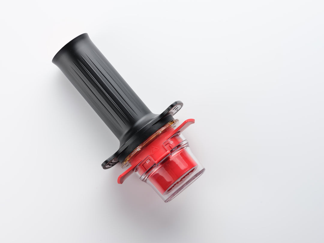A manual grinder works by turning the crank handle to rotate the burr and crush the coffee beans into smaller particles. The grind size can be adjusted by changing the distance between the burrs.